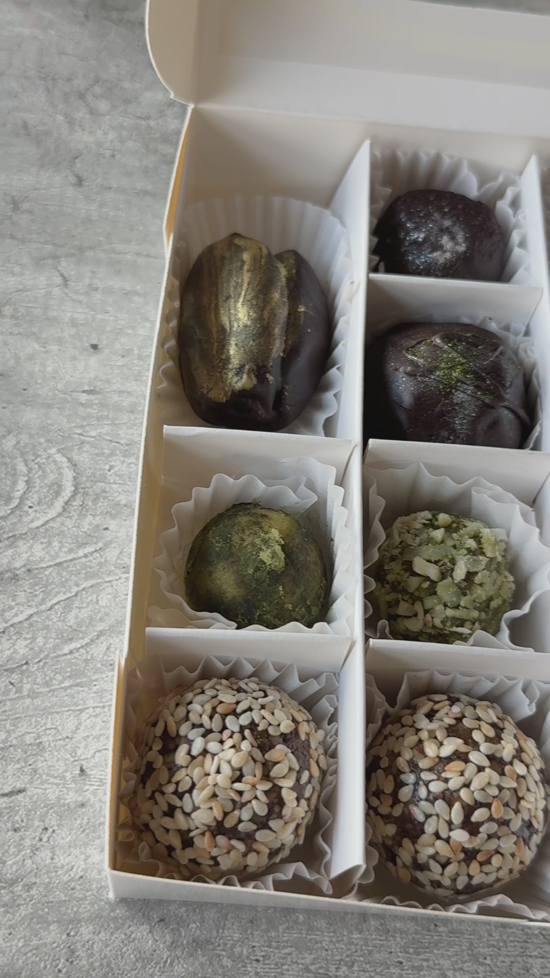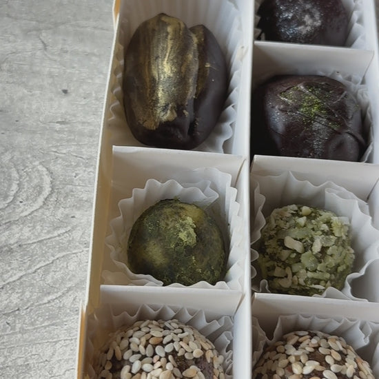 Gold Walnut Date (double size), Chocolate Carrot Walnut, Sesame Fruit & Nut Bite, Matcha Almond Orange, Matcha Coconut Nut Mix, Silver Citrus Nut Date (variety may vary)