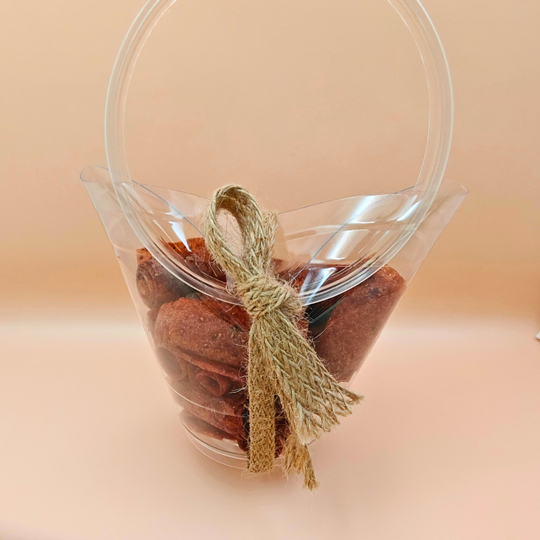 Presented in a clear cup with a handle and tied with a rustic ribbon or seasonal accent โ perfect for gifting, snacking, or party favors.